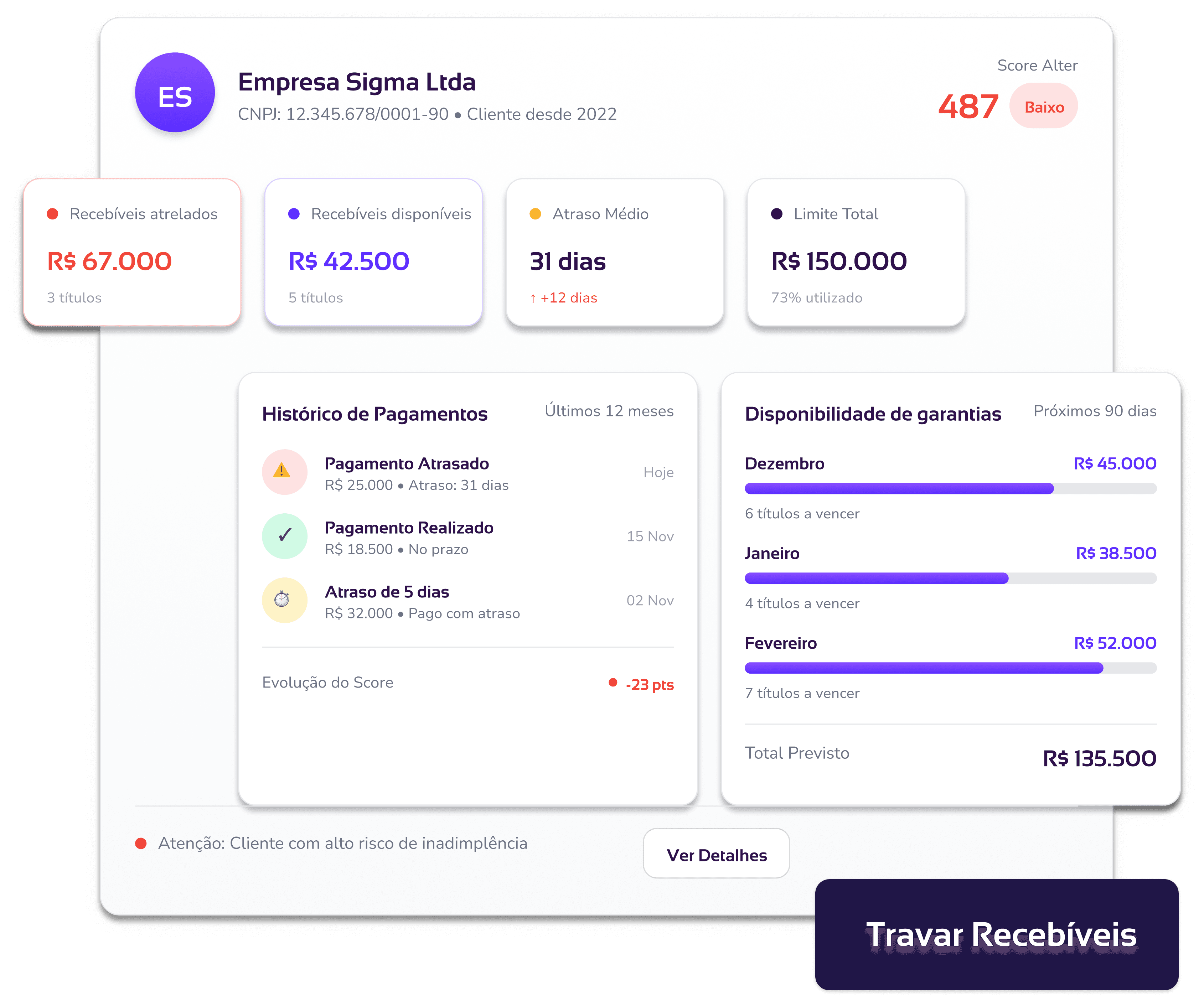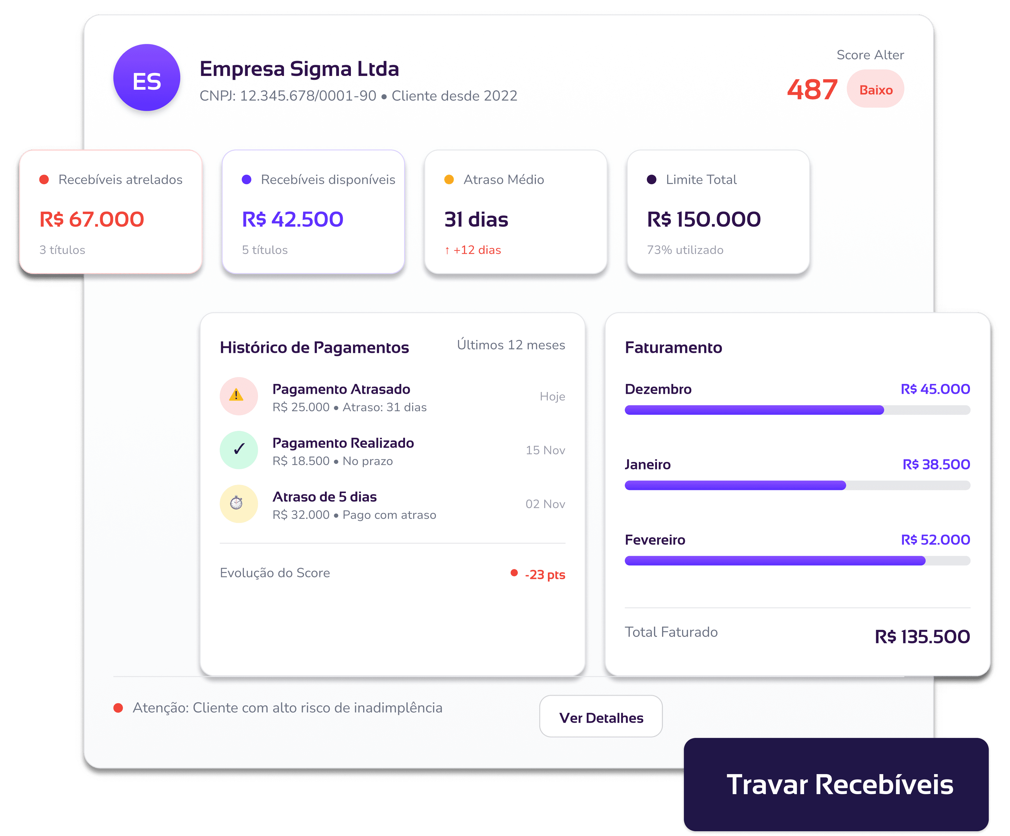 Relatórios estáticos não refletem a saúde financeira real dos clientes, o que restringe a concessão de crédito. Com a Alter, você acessa dados de faturamento e contas pagas, e utiliza garantias de pagamento que permite conceder crédito de acordo com capacidade de pagamento do seu cliente aumentando em até 22% o share no pdv.